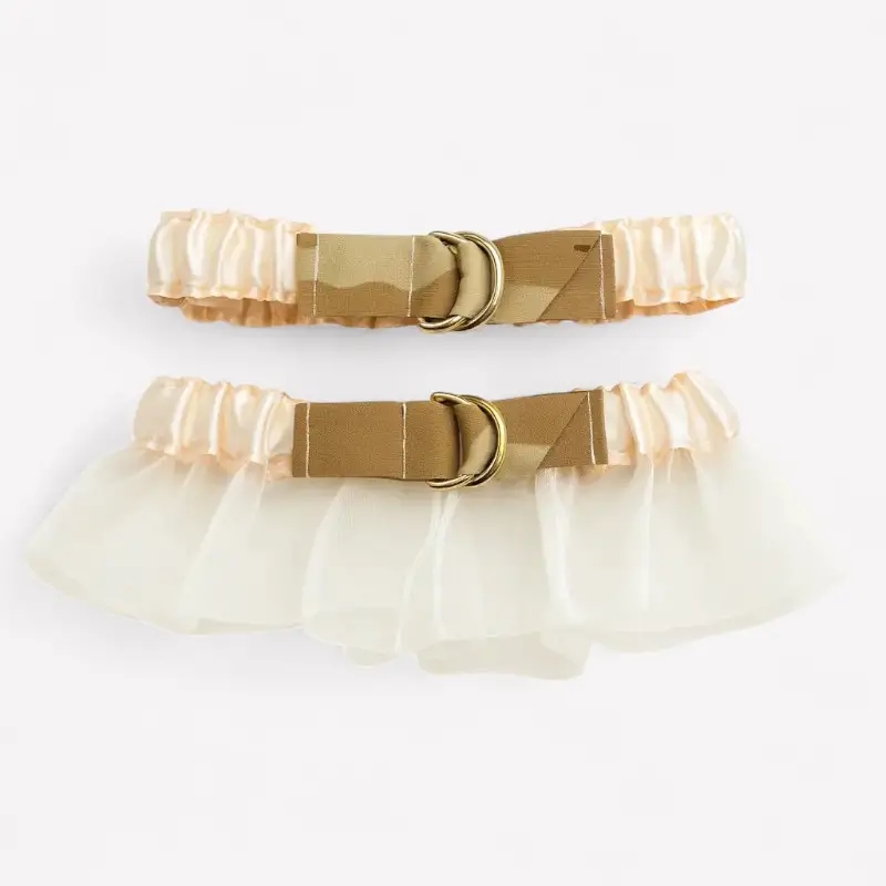 Deze set van twee kousenbanden combineert zachte perziktinten met een bruin camouflagedetail – perfect voor de bruid die haar outfit graag een verrassend accent geeft.