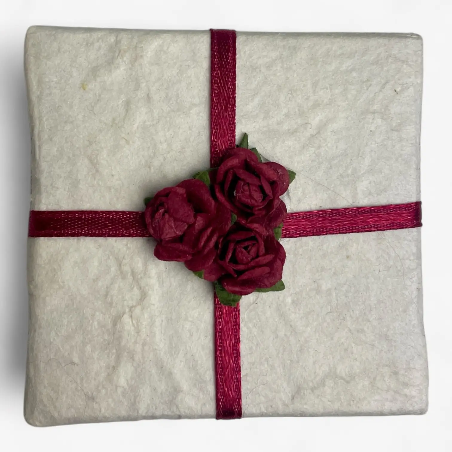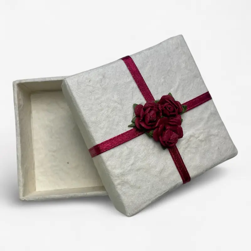 Een romantisch geschenkdoosje met een natuurlijke uitstraling. Dit vierkante doosje is met de hand gemaakt van stevig geschept papier en afgewerkt met bordeauxrode satijnlinten die elkaar kruisen op het deksel. In het midden prijkt een klein boeketje van papieren roosjes – een subtiel detail dat het doosje een luxueuze, ambachtelijke uitstraling geeft.