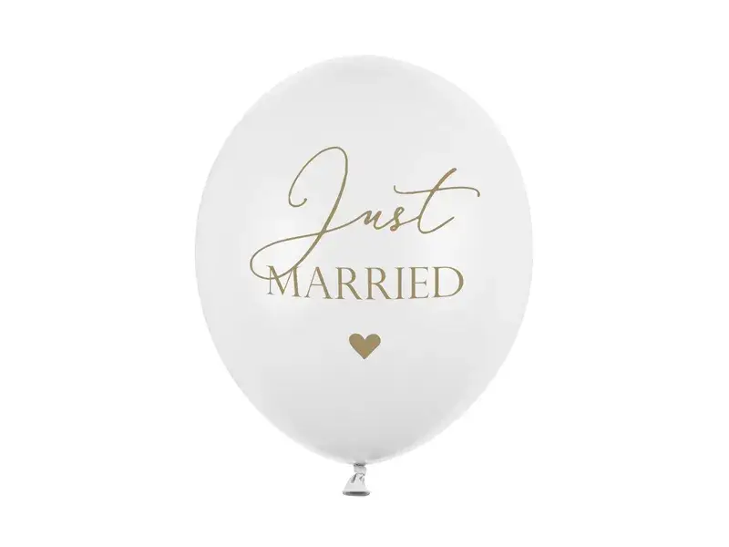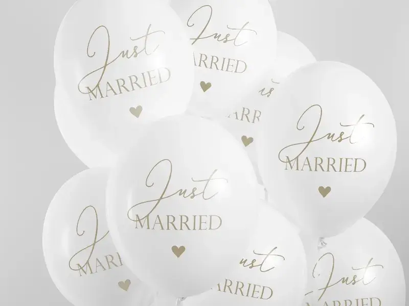 De ballonnen hebben een heldere, pure witte kleur en zijn bedrukt met Just Married,