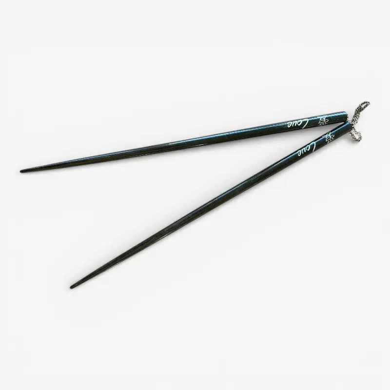 De eetstokjes hebben een diepe zwarte kleur en zijn afgewerkt met de tekst “Love” in een lichte tint. Aan het uiteinde zit een klein decoratief detail dat het geheel een verfijnde uitstraling geeft. Ideaal voor een diner met een liefdevol thema, een bruiloft, Valentijnsdag of een intieme avond samen.