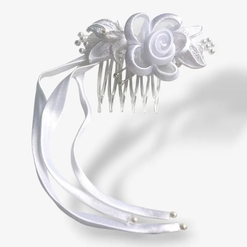 Witte haarkam met satijnen roos en linten