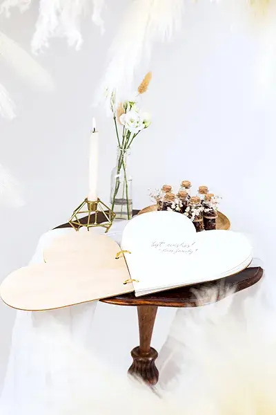 Leg de mooiste wensen van jullie gasten vast in dit unieke houten gastenboek in hartvorm. De voorzijde heeft een uitgesneden hart en een elegante uitstraling die perfect past bij een romantische bruiloft of jubileum.