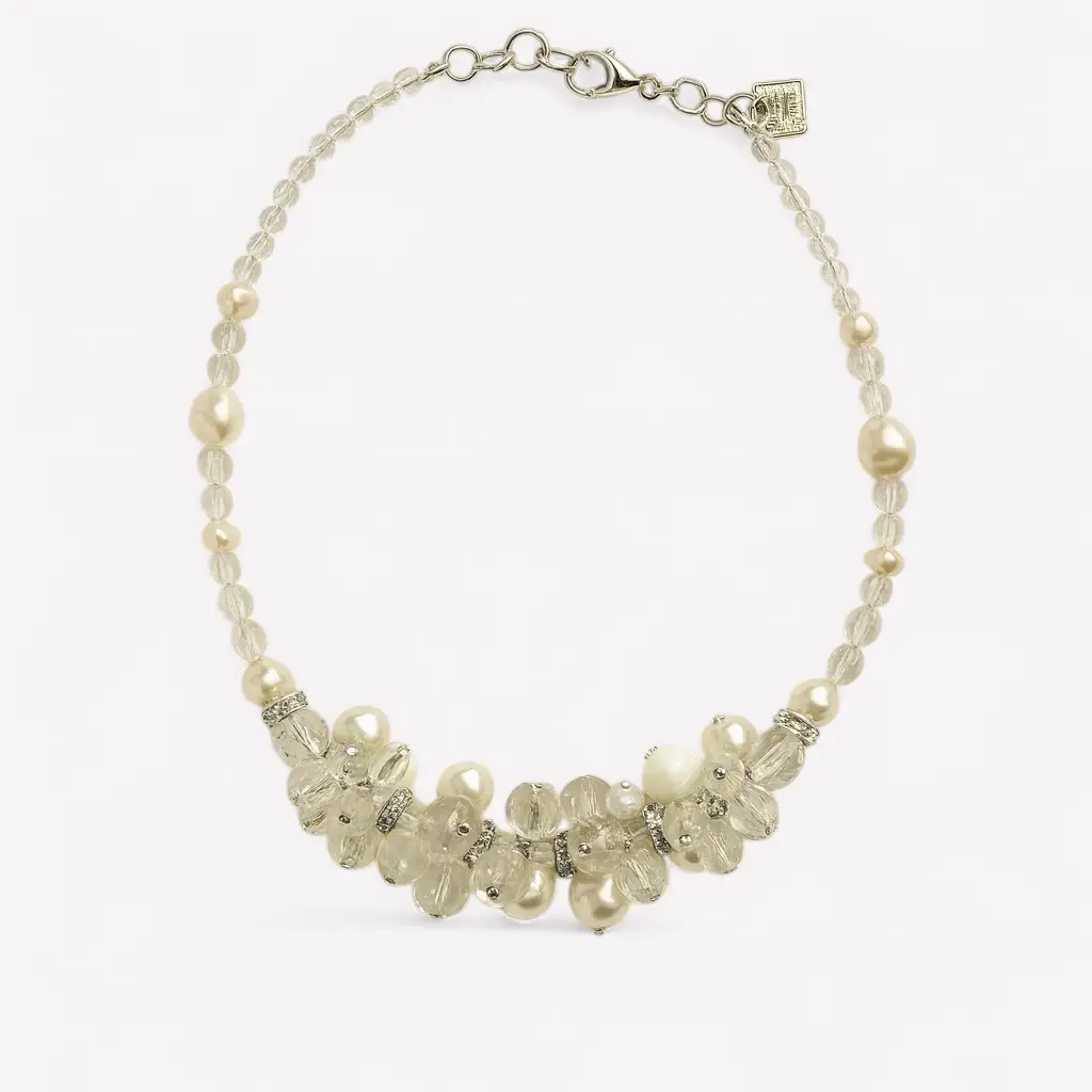 Deze verfijnde ketting is ontworpen met wild gevormde parelkralen, transparante glaskralen en subtiele strassdetails, gerangschikt in een speels bloemdesign. Met een lengte van 39 cm en een verlengstuk van 7,5 cm valt hij mooi rond de hals en geeft hij iedere outfit een luxueuze, romantische touch. Perfect voor bruiloften, feestelijke diners en bijzondere gelegenheden.