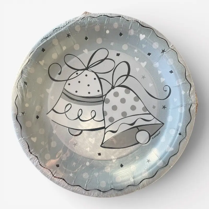 Het bordje is versierd met sierlijke klokjes, subtiele hartjes en verfijnde patronen in zilvergrijs. Ideaal voor taart, gebak of kleine hapjes tijdens een bruiloft, verlovingsfeest of jubileum. Praktisch in gebruik en na afloop eenvoudig op te ruimen.
