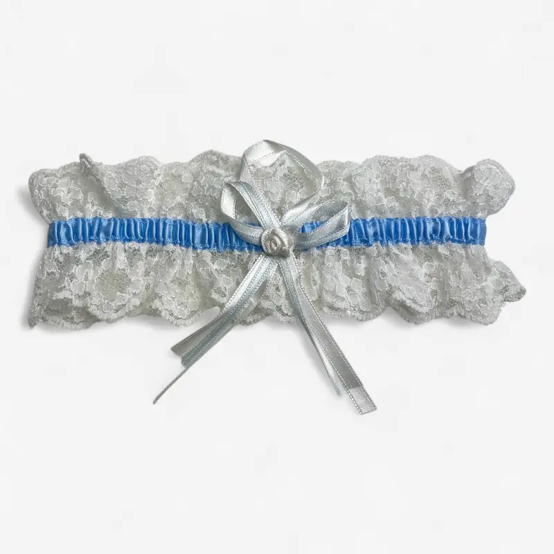 De kousenband met blauw detail is een prachtig symbolisch item voor de trouwdag zelf – een charmant gebaar naar traditie, liefde en geluk in het huwelijk.