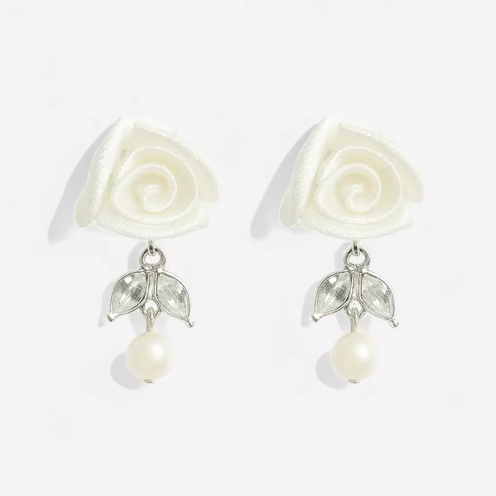 Deze elegante oorbellen combineren een ivoorkleurig satijnen roosje met een verfijnd zilverkleurig stekertje. Het subtiele roosje van ca. 1,5 cm vormt de basis, terwijl het elegante hangertje met glinsterende blaadjes en een zachte parel de oorbel een totale lengte van 3 cm geeft.