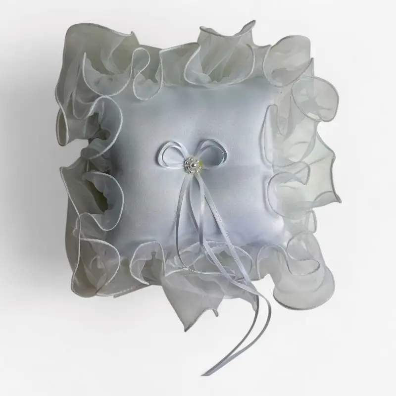 Het kussen (22 × 22 cm) heeft een verfijnde uitstraling dankzij de zachte glans van de stof en de luchtige organza volant rondom. In het midden siert een subtiel strikje met pareltjes en linten de voorkant — een klassieke, romantische keuze voor de ceremonie of trouwfoto’s.Dit is een outlet exemplaar: volledig nieuw, maar met een mini-imperfectie in de afwerking.