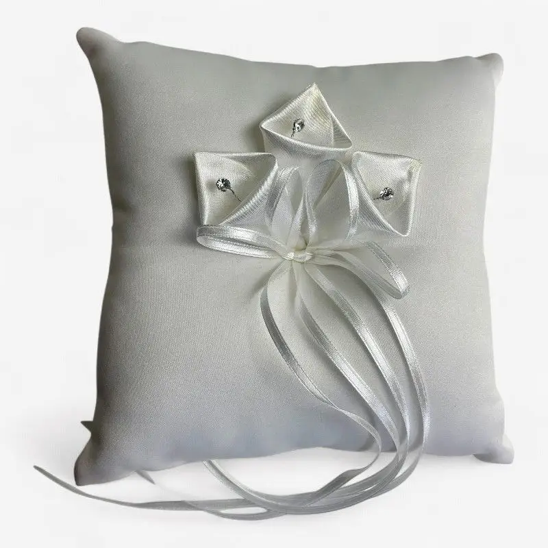 Dit Ringkussen Ivory Bloom is uitgevoerd in zacht ivoor satijn en versierd met drie elegante kelkvormige bloemen met strass-steentjes.
