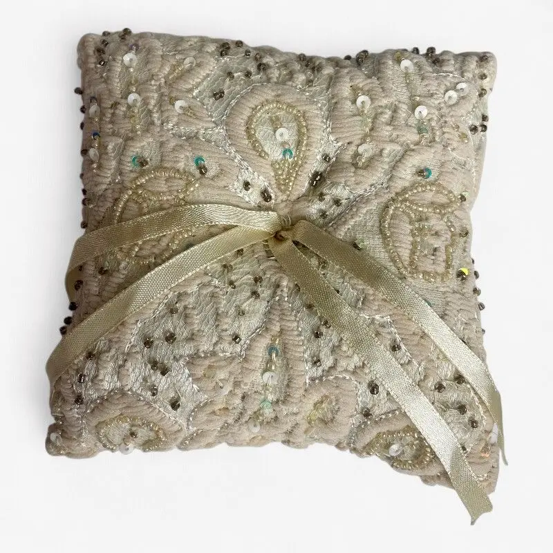 Het Ringkussen Ivory Gold straalt elegantie uit met zijn goud-ivoren tinten, subtiele glans en rijke afwerking met kraaltjes en pailletten — een perfecte keuze voor een chique ceremonie.