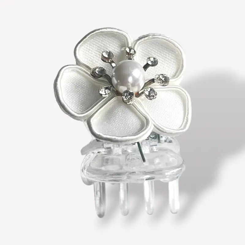 Een vleugje elegantie voor elk kapsel: de Satin Shine bloemclipjes voegen subtiele glans toe met hun satijnen bloemblaadjes, glinsterende strass en een zacht parelaccent in het midden. Dankzij het transparante klemmetje lijken de bloemen als vanzelf in het haar te zweven. Perfect voor bruidjes, feestjes of fotoshoots waarbij je kapsel net dat extra sprankeltje mag hebben.