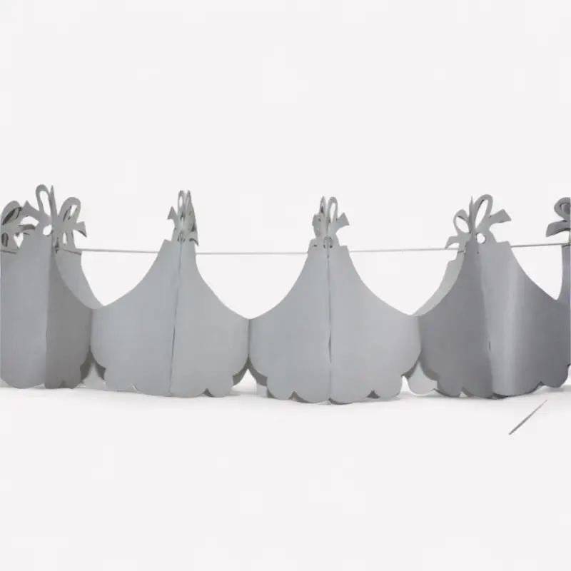 De slinger is gemaakt van stevig papier en heeft een totale lengte van 6 meter. Door de lichte glans en subtiele vorm past hij moeiteloos bij elke bruiloftsstijl – van klassiek tot modern. Dankzij het bijgeleverde touw is de slinger eenvoudig op te hangen en meerdere keren te gebruiken.