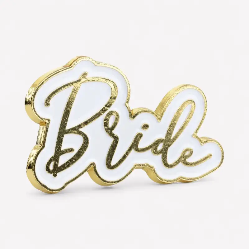 Een subtiel maar sprankelend detail voor de bruid! Dit elegante speldje met de tekst “Bride” is een perfecte accessoire voor de vrijgezellenavond, bridal shower of de ochtend van de bruiloft. De combinatie van wit en goud geeft het een chique uitstraling die past bij iedere outfit.