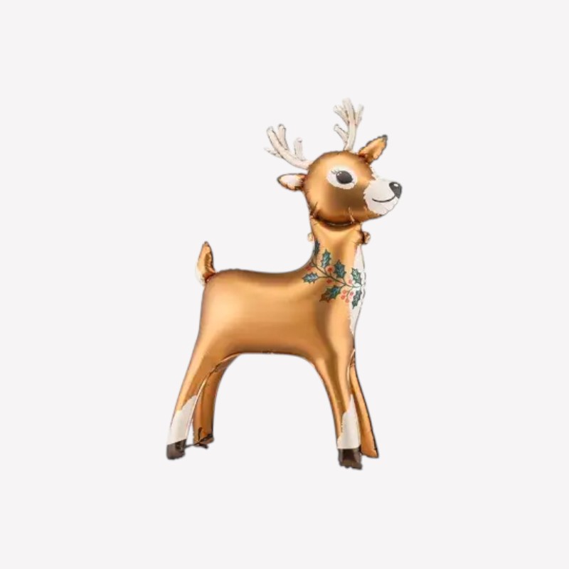 Een echte blikvanger voor de feestdagen . Deze vrolijke staande folieballon in de vorm van een rendier brengt direct kerstsfeer in huis. Dankzij de prachtige mix van goud- en bruintinten en het vriendelijke ontwerp past hij perfect bij elk winterfeest, van een gezellige familieviering tot een feestelijke bruiloft.