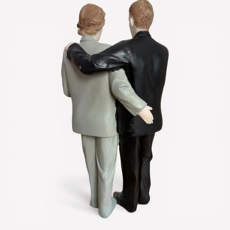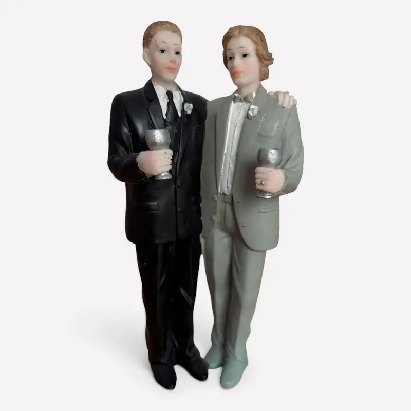 Deze bijzondere taarttopper toont twee heren in stijlvolle pakken, samen proostend op een nieuw hoofdstuk. De combinatie van een klassiek zwart pak en een lichtgekleurde variant zorgt voor een chique en moderne uitstraling.