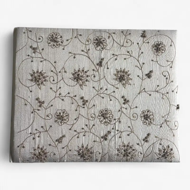 Dit unieke gastenboek is met de hand gemaakt en bekleed met ivoorkleurige zijde. Het oppervlak is gedecoreerd met sierlijk geborduurde bloemmotieven en subtiele glanzende kralen. De binnenzijde bevat crèmekleurige blanco pagina’s — perfect voor persoonlijke boodschappen, felicitaties en namen van gasten. Een luxe keuze voor bruiloften, jubilea of andere bijzondere gelegenheden.